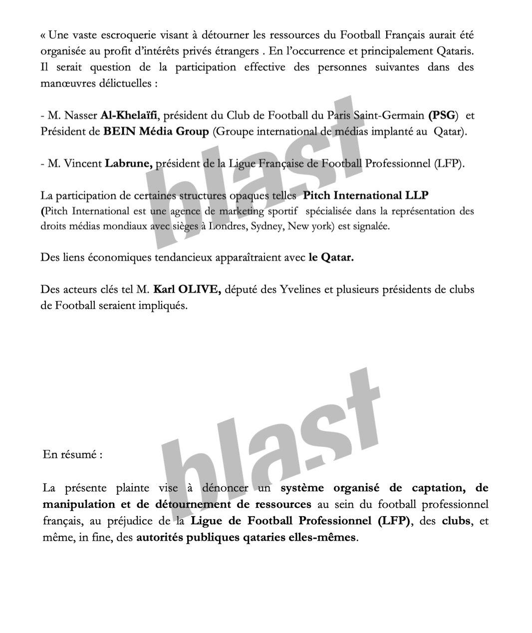 Leur nouvelle alerte, que Blast a pu consulter, s’étend sur 27 longues et explosives pages. Elle revisite rien de moins que les 15 dernières années du football français, au prisme d’une escroquerie en bande organisée pilotée par Nasser Al Khelaïfi, patron du PSG et Bein Sports, Vincent Labrune, président de la LFP, Karl Olive, député macroniste, les président de Reims (Jean-Pierre Caillot), Montpellier (Laurent Nicollin) et consorts, accusés d’avoir spolié la Ligue de football professionnel, les clubs pros, et même le Qatar.
